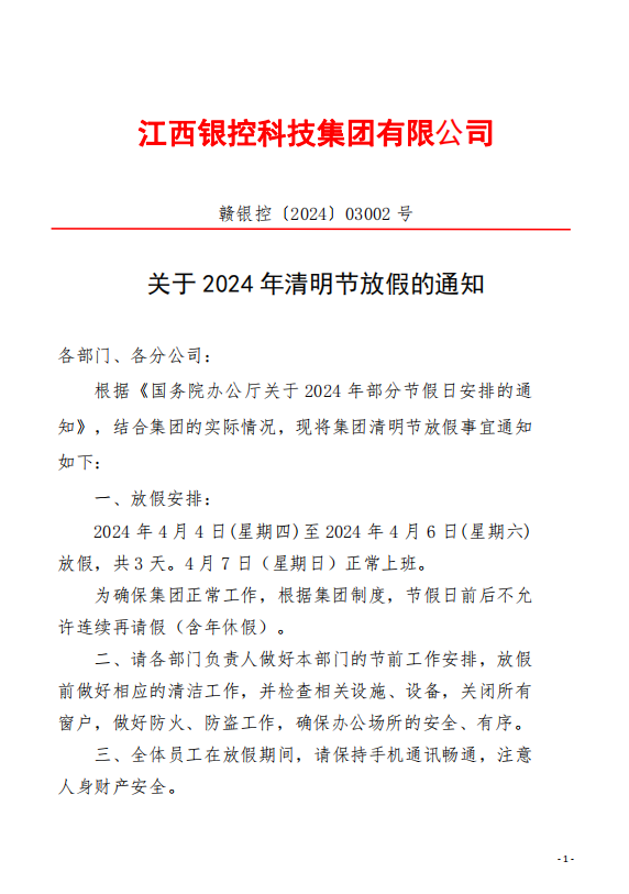 請(qǐng)各部門提前做好工作安排,放假前確保關(guān)閉門窗、電源,消除安全隱患。節(jié)假日期間大家做好人身財(cái)產(chǎn)安全防護(hù)!